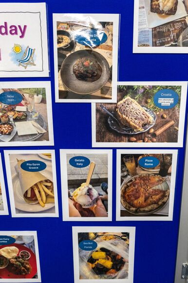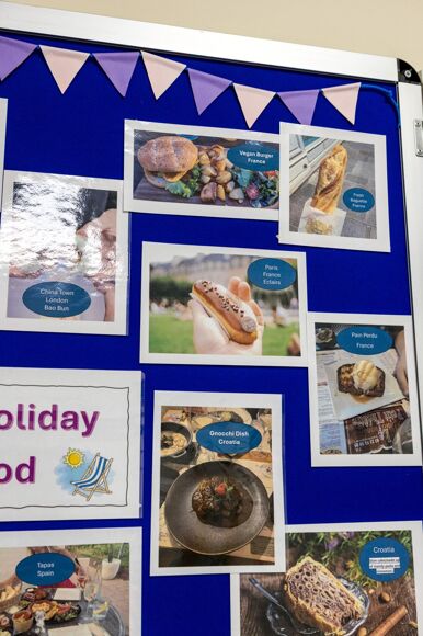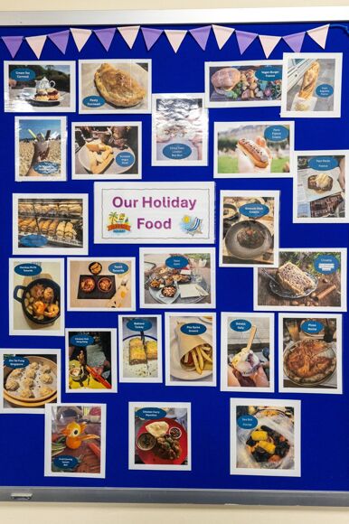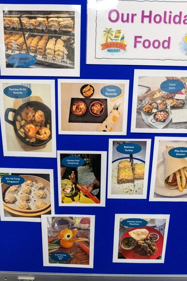 Miss Behagg set homework for year 8 and 10 students over the summer holidays, to take photos of a food that represents a place or country where they went on holiday. She was very impressed with the responses and variety, which are now on display outside F1.